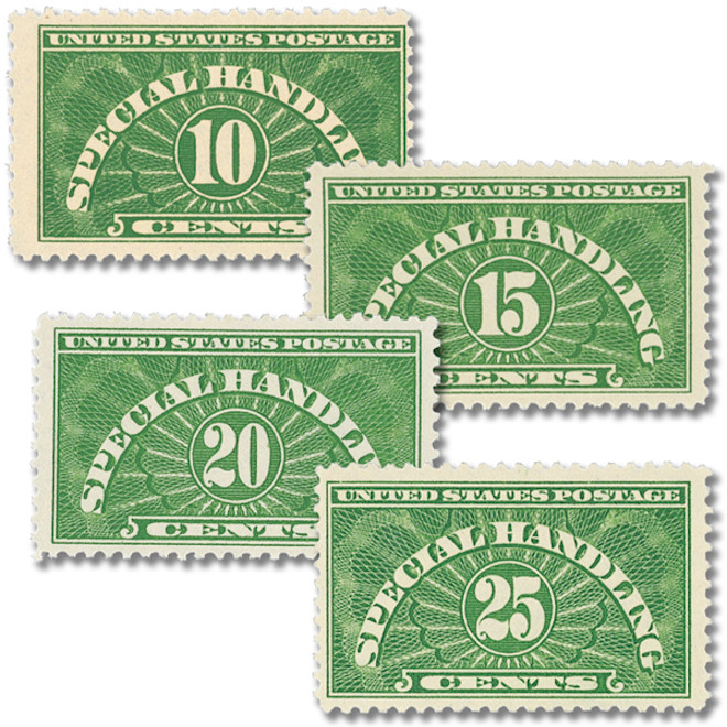 QE1-4 – 1925-55 Special Handling Stamps, Set of First 4 Original Stamps