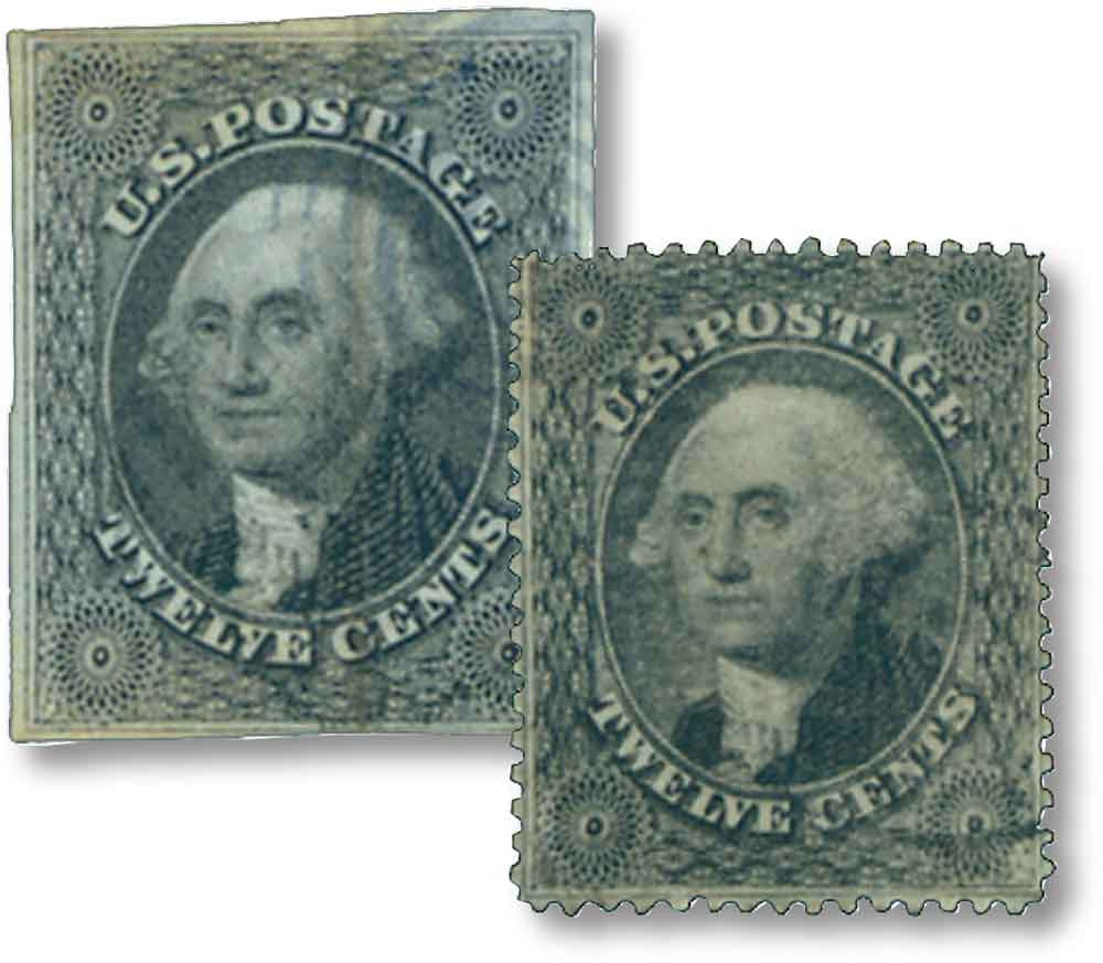 As you would expect with stamps this old, your 12¢ Washingtons will have one or two minor imperfections – like a slight thin or tiny tear.  These minor flaws won’t detract from the beauty or collectability of these classic stamps, but they do allow you to save money off Mystic’s US Stamp Catalog price.