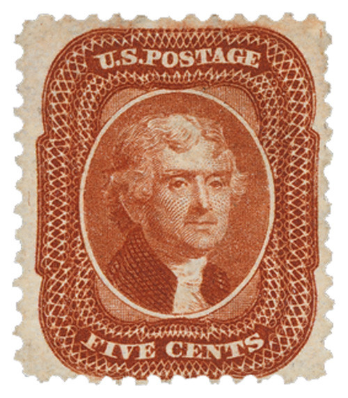 History the stamp represents: The 5c Jefferson is a reprint of #28, issued in 1857. The stamp was displayed at the 1876 Centennial International Exposition, but was not sold there. It and the other Centennial exposition issues were only available by special order at the Office of the Third Assistant Postmaster in Washington, DC.