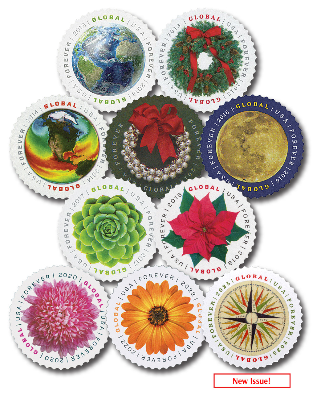 This is your chance to own 10 international rate Forever stamps in one convenient, money-saving set. These large, round stamps were introduced in 2013 to simplify international mail by offering a single stamp for all international destinations.