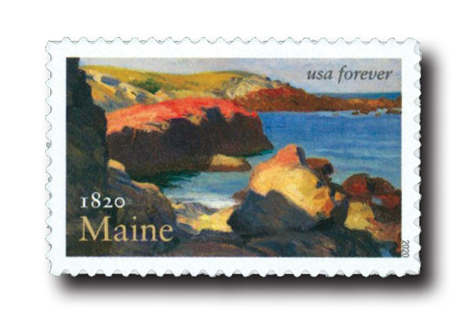 The USPS recognized the 200th anniversary of Maine’s statehood in 2020 with a new Forever stamp. The design featured an oil painting by noted American Realist artist Edward Hopper. Hopper was inspired by the rocky coastlines of New England and spent much of his life painting what he saw there.