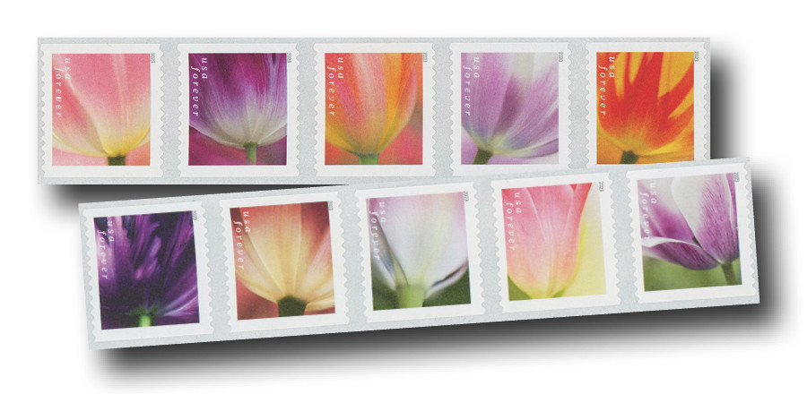 About the stamp design: All 10 stamp designs picture close-ups of tulips from photographs by Denise Ippolito. The flowers fill nearly the entire frame of each stamp.