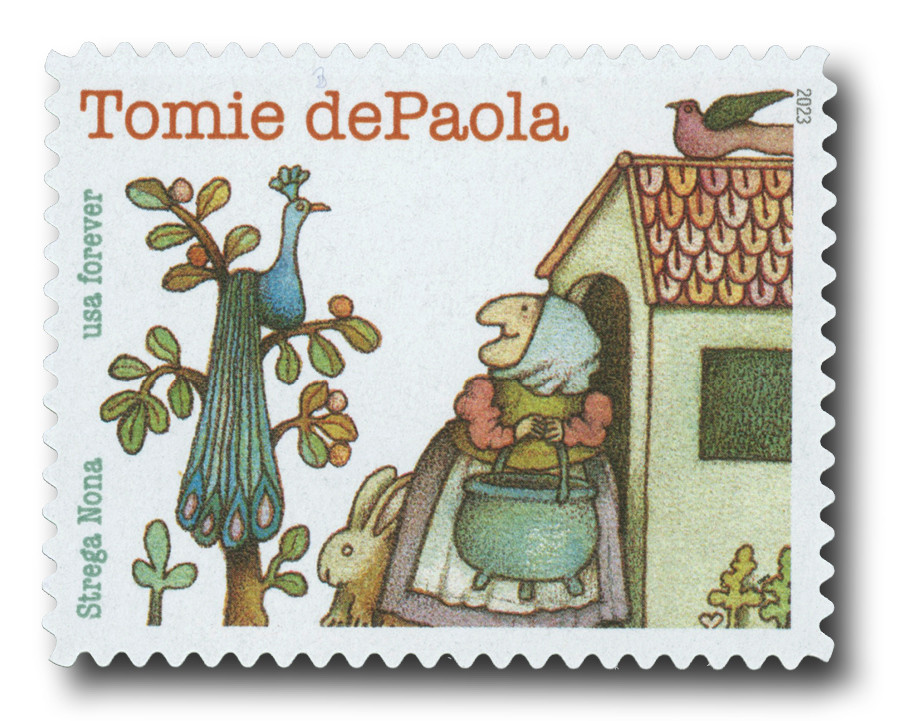 History the stamp represents:  Thomas Anthony “Tomie” dePaola (September 15, 1934 – March 30, 2020) was a beloved author and illustrator known for his children’s books.  He wrote such stories as Nana Upstairs & Nana Downstairs (1973), Strega Nona (1975), and more.