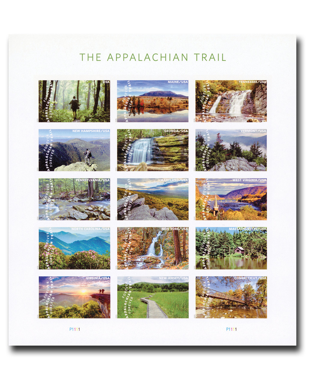 About the stamp designs: USPS art director Antionio Alcalá created the Appalachian Trail stamps with existing photographs. Fourteen of the stamps identify the states in which the photos were taken, while one simply reads “USA,” representing a portion of thick forest known as the “green tunnel.” The images on the stamps, in the order they appear on the sheet are: