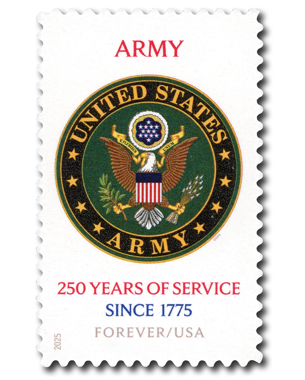 In 2025, the USPS issued a stamp marking the Army’s 250th anniversary picturing the official Army service mark. The bald eagle clutching arrows and an olive branch symbolizes readiness for war and commitment to peace. Above the eagle, a constellation of stars represents unity under a higher purpose. This stamp stands as a tribute to the centuries of service, sacrifice, and strength that define the Army’s role in safeguarding America’s freedom.