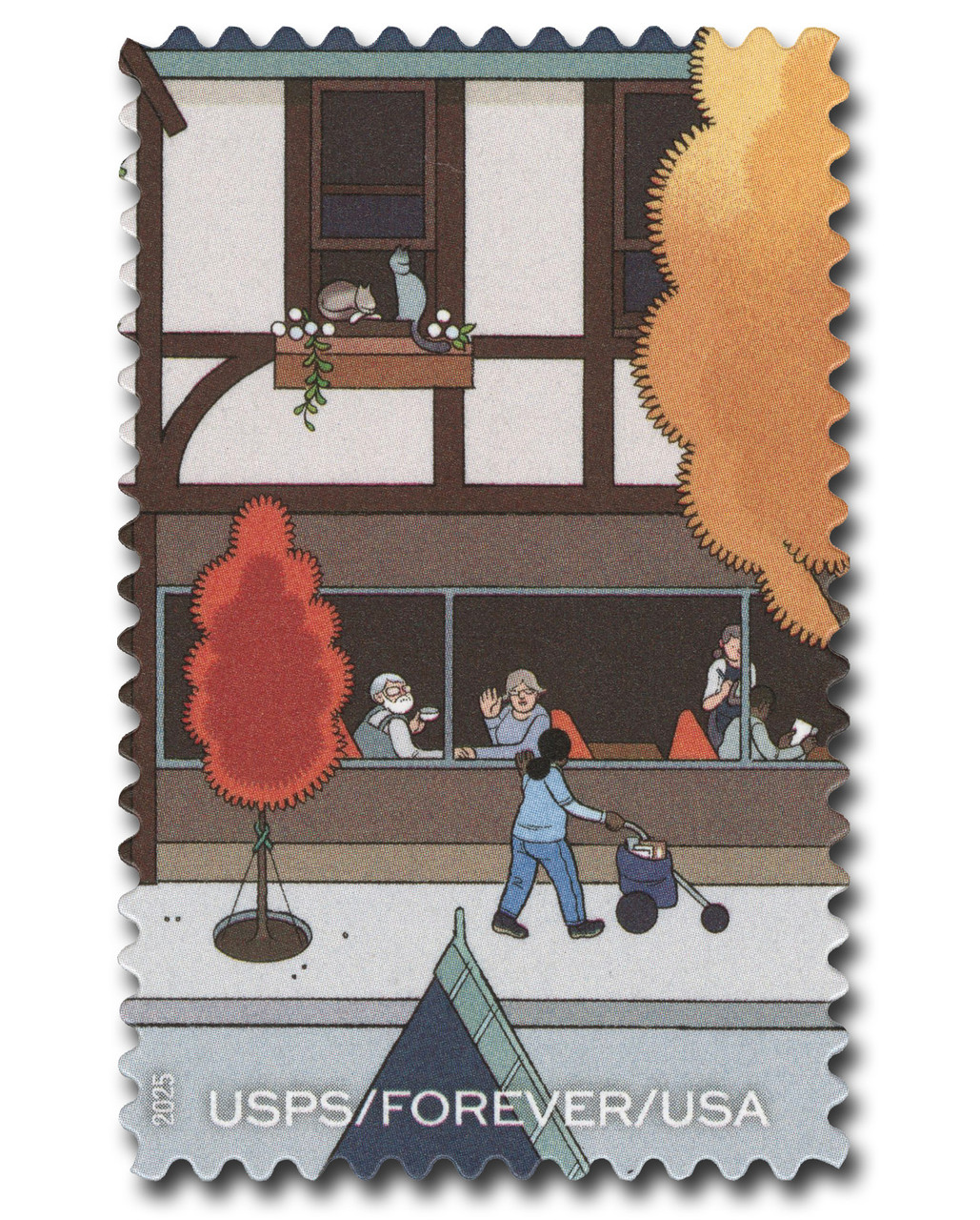 About the stamp design: The pane was illustrated by cartoonist Chris Ware. The stamps connect to form a scene highlighting the presence of the Postal Service throughout the years and the important role it has played in American life over a century and a half. The artwork follows a mail carrier as she walks her daily route through a busy town over the course of the year.