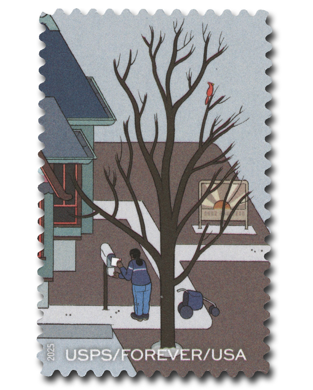 To honor this milestone, this pane of 20 stamps was released, each depicting moments in the life of a modern mail carrier over a year’s time. These stamps tell the story of a community, following the carrier as she braves all seasons delivering letters and packages, while making connections with members of the community. The stamps celebrate the mail carriers who embody the iconic creed, “Neither snow, nor rain, nor heat, nor gloom of night stays these couriers from the swift completion of their appointed rounds.”