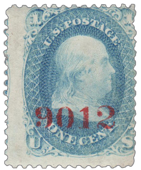 63SJ – 1861 1c Franklin, Blue, Specimen, Overprint Control Number 9012