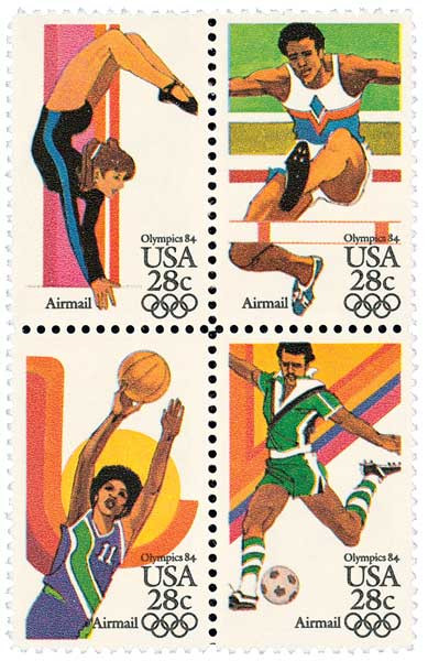 This se-tenant commemorates the 23rd Olympic Games which were held in Los Angeles during the summer of 1984.  The block features assorted sports including women’s gymnastics, women’s basketball, soccer, and the men’s hurdles.