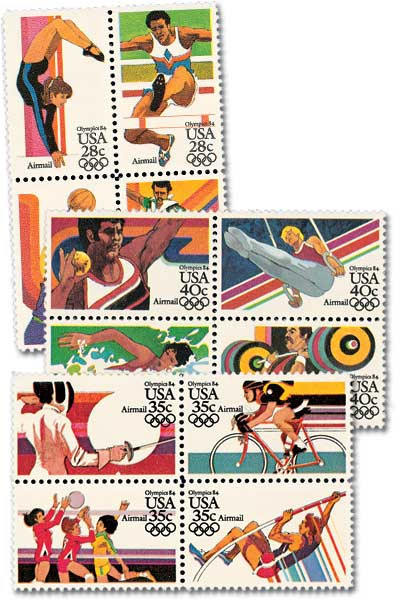 All 12 of the 1983 Commemorative Airmails picture athletes participating in Olympic events. These stamps were issued in anticipation of the 1984 Summer Olympic Games in Los Angeles. The four 28¢ stamps each covered the postcard rate to any country in the world except Canada and Mexico, which cost the then-current domestic rate of 13¢.