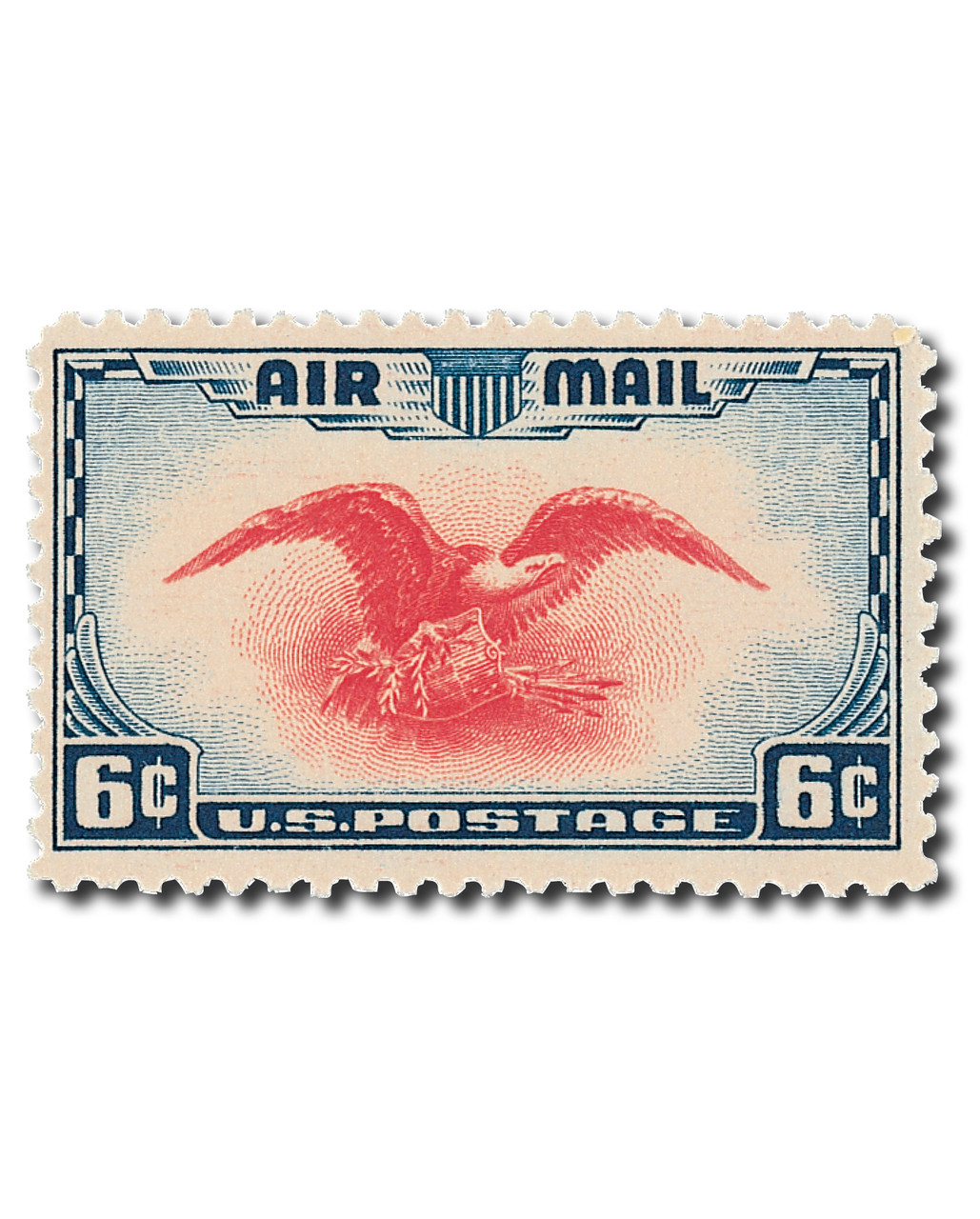 This bi-colored 6¢ airmail stamp was issued in celebration of National Airmail Week, which commemorated the 20th anniversary of the first government airmail flight. President Franklin Roosevelt, a stamp enthusiast, was presented with some possible designs for the new stamp, but sketched his own idea instead. His flying eagle became the picture on the new airmail stamp.