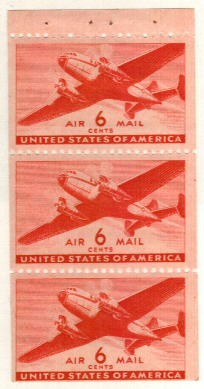 A new set of airmail stamps with the twin-motored transport plane design made their appearance beginning in 1941. These stamps covered the various rates in effect for both domestic and overseas airmail service. The 6¢ issue covered domestic airmail service. This is identical to #C25 but in booklet form.