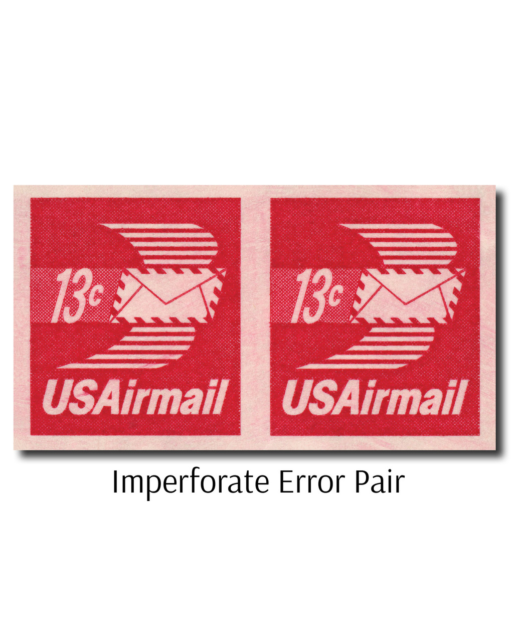 This pair of C83 Airmail stamps were intended to be perforated vertically. During production, the perforations weren’t applied and these stamps slipped past the watchful eyes of postal inspectors.