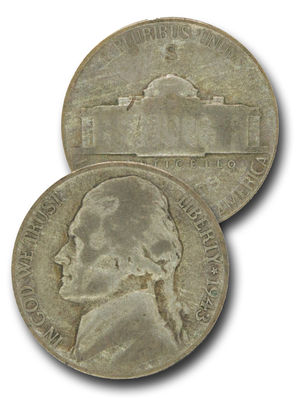 America’s entrance into World War II changed everything – including US coins.  Because the metals used to produce the 5-cent piece were needed for the war machine, the US Mint had to change the coin’s composition.  Ever since 1866, nickels had been produced using 75% copper and 25% nickel.  When the US joined the war after the attack on Pearl Harbor, nickel was suddenly in high demand for use in preventing rust in armor.  In addition, copper was needed for shell casings on ammunition.