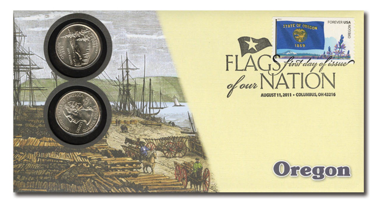 This Flags of Our Nation First Day Cover marks the First Day of Issue of the Oregon Flag stamp. It features two encapsulated uncirculated Oregon quarters plus a full-cover cachet and First Day of Issue postmark. The reverse side features interesting historical information about the state and its flag.