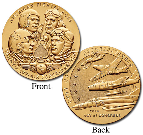 This commemorative medal honors American fighter aces from the Army, Navy, Air Force (then part of the Army), and Marines. Fighter Aces are those pilots that destroyed five or more enemy aircraft during the war. Thousands of fighter pilots participated in the war – but only 1,279 downed enough enemy aircraft to become fighter aces. Of these, 735 came from US Army Air Forces, 381 from the Navy, 122 Marines, 22 with the Royal Air Force and 19 with the American Volunteer Group, also known as the Flying Tigers.