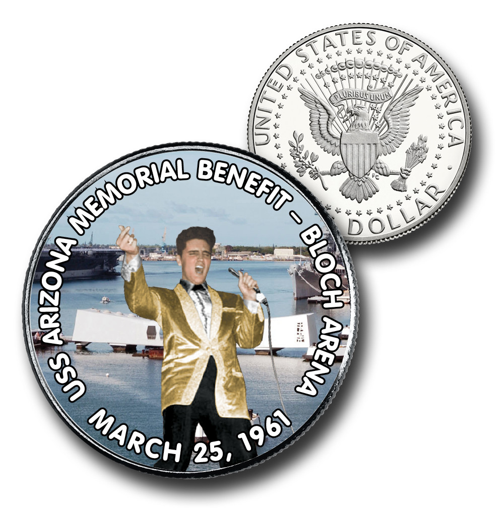 In 1961, Elvis performed in Hawaii to raise money for a historic memorial.  This coin features that performance.