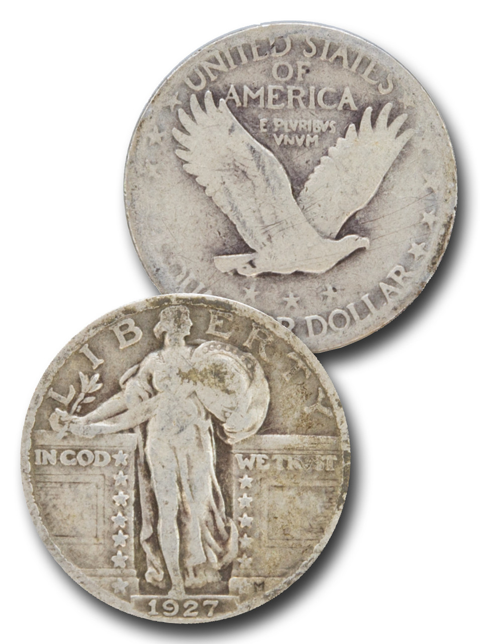 The Standing Liberty quarter was produced between 1916 and 1930.  It was made with 90% silver and 10 % copper and symbolized America’s stand in World War I.