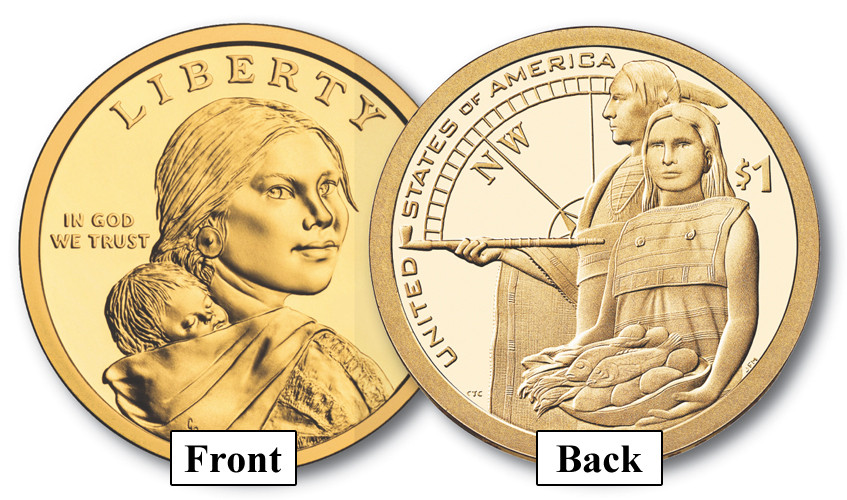 About the $1 Native American Coin Program:  In 2009, the US Mint began issuing $1 coins in accordance with the Native American One Dollar Coin Act.  Each coin pictures a portrait of Sacagawea on the “heads’ side and a special yearly design on the “tails” side.  They honor the contributions of Native Americans throughout US history, whether it be individuals or larger communities.