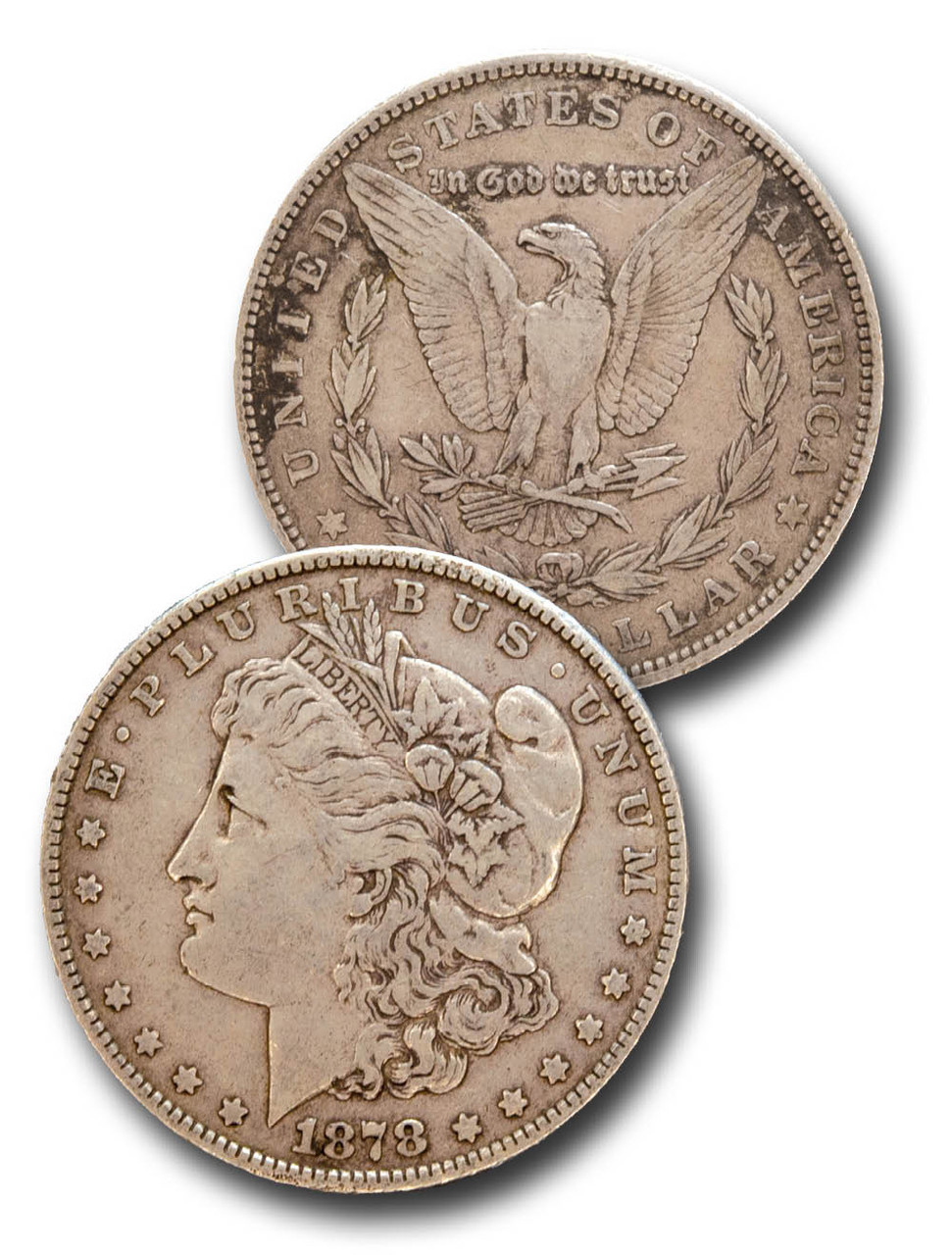 The Morgan dollar was named for its designer and engraver, George Morgan. The coin was minted from 1878 to 1904. Made of 90% pure silver, it was produced in response to a change in US policy toward coining silver.