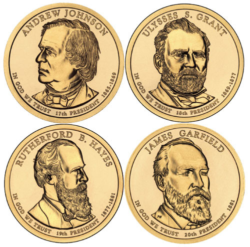 With one easy order, you can get all four 2011 coins honoring Andrew Johnson, Ulysses S. Grant, Rutherford B. Hayes, and James Garfield. Order yours now.
