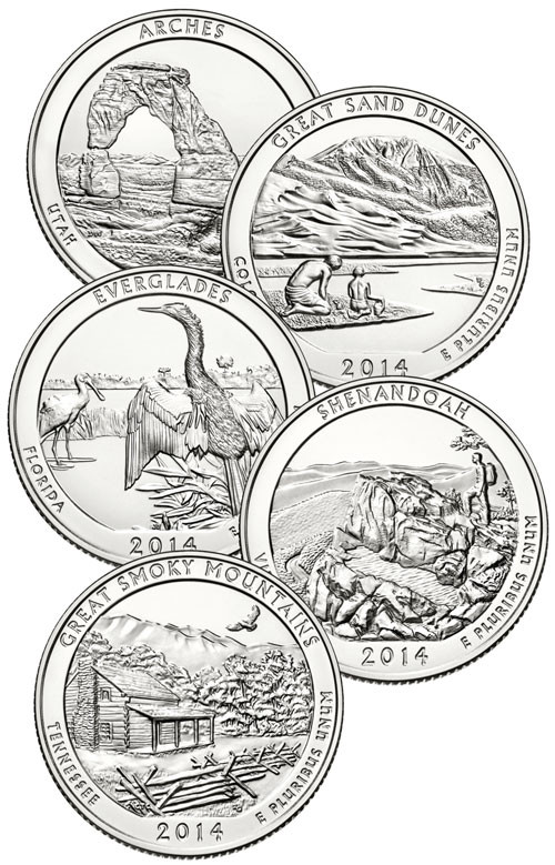 This is your chance to get all five 2014 quarters from the Denver Mint in one convenient set. The 2014 quarters featured Great Sand Dunes, Everglades, Great Smokey Mountains, Arches, and Shenandoah National Parks. Each coin features an image representing the park’s natura features, history, wildlife, and more.