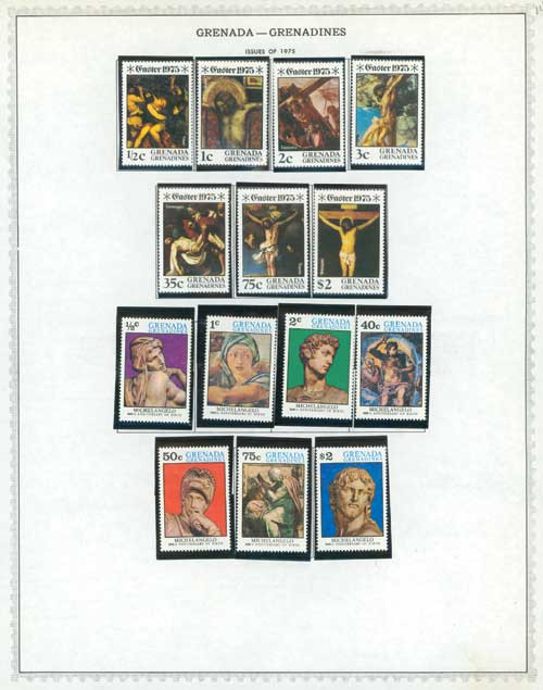 Mint collection of about 350 stamps mounted on album pages. Mostly Complete Sets plus many Souvenir Sheets. Some lightly hinged.Grenada, the smallest independent country in the Western Hemisphere, is 133 square miles located at the very southernmost tip of the West Indies, about 90 miles off the coast of Venezuela, South America. The main island of Grenada is surrounded by about six hundred small islands called the Grenadines, half of which belong to Grenada, and half of which belong to St. Vincent. But even though Grenada is remote, it hasnÕt remained undiscovered. Tourism is becoming an increasingly important industry on this mountainous island. GrenadaÕs tropical climate, warm sun, and lovely beaches are genuine attractions. That may be how Columbus felt when he first spotted the island of Grenada in 1498. The first settlers on Grenada, however, were French. Next, the British took control of the country. In fact, this British colony didnÕt become an independent republic until 1974. Grenada now has its own constitutional government which is working to increase trade and tourism. Almost everyone in Grenada speaks English. After a military coup in October 1983 resulted in the execution of Prime Minster Maurice Bishop, U.S. forces invaded Grenada. American troops succeeded in subduing the Grenadian Army and its Cuban advisors.The people of Grenada offer tourists a wonderfully natural and beautiful spot for those who want to get away from it all. They can stroll along the beaches and live on a simple diet of fish, tropical fruits and drinks. And since there are less than 95,000 residents of the country, theyÕre not apt to feel crowded. The majority of people (62%) work in the tourist industry, and the rest are occupied in harvesting the main Grenada crops of nutmeg, bananas, cocoa, and sugar. They are primarily people of color, with a mainly Roman Catholic background. Even the capital of Grenada, St. George, has a population of only 30,000 people.