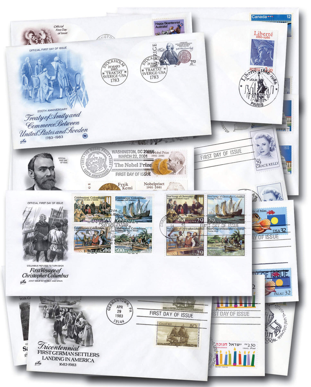 Collecting these joint issues on limited-edition First Day Covers lets you see the stamps side-by-side.  (Most covers you receive will feature stamps from both the US and its joint issue partner, but a few may include just the foreign stamp.).  You can also compare their cancels, several of which had fun pictorial designs.  Plus, the artwork cachets on each cover perfectly compliment the stamps.