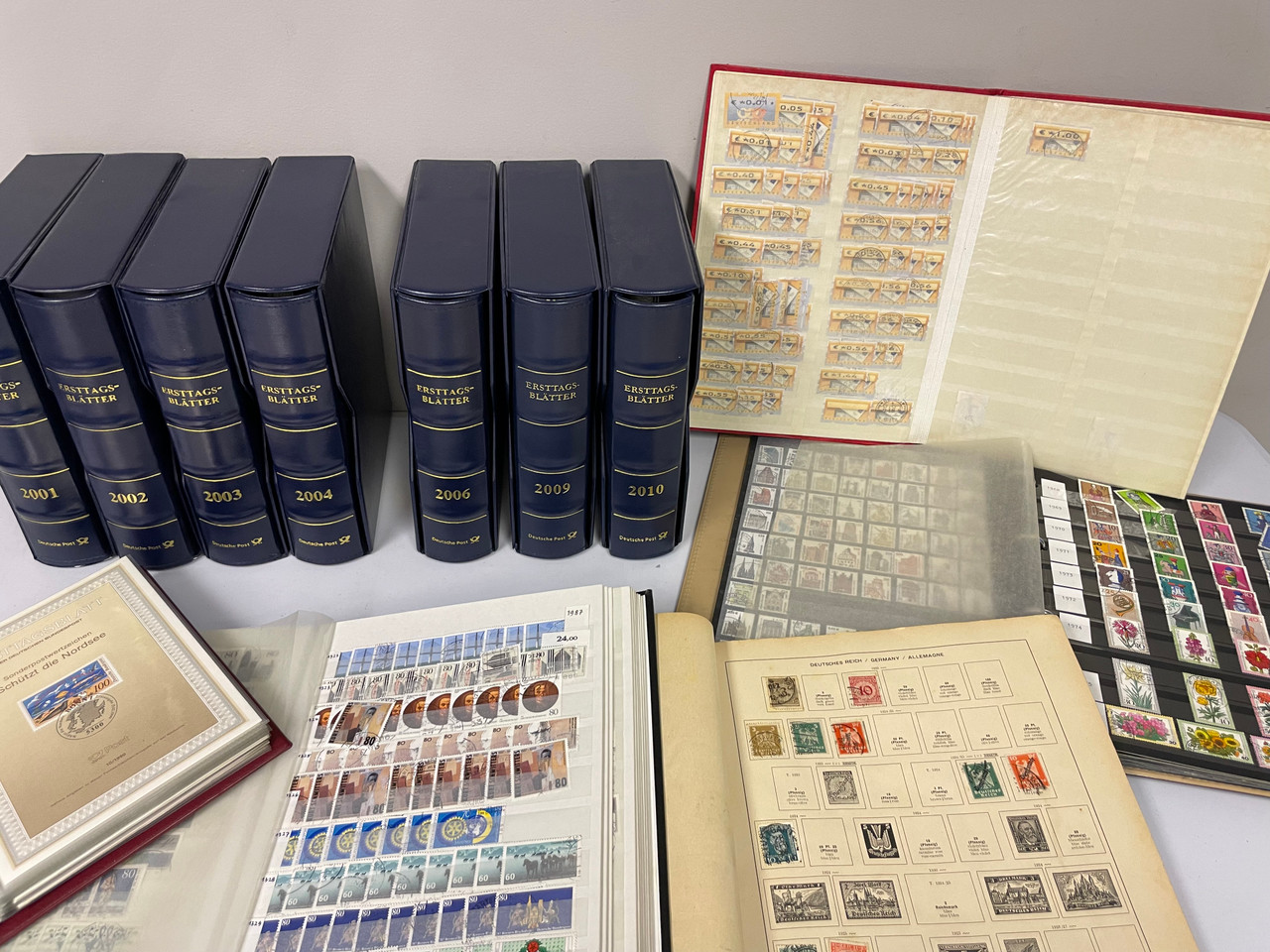 Seven Germany albums containing commemorative panels with stamps affixed, canceled on the first day of issue. Years range from 2001-10, missing a few years. About 40 panels for each year. Each album has slipcase, immaculate looking collection. Also includes 1989-90 album with same style panels, looks like many semipostals included here, two stock books with some duplication and an old Schaubek album with used Germany stamps. Lots here for someone looking to expand or start a Germany collection!