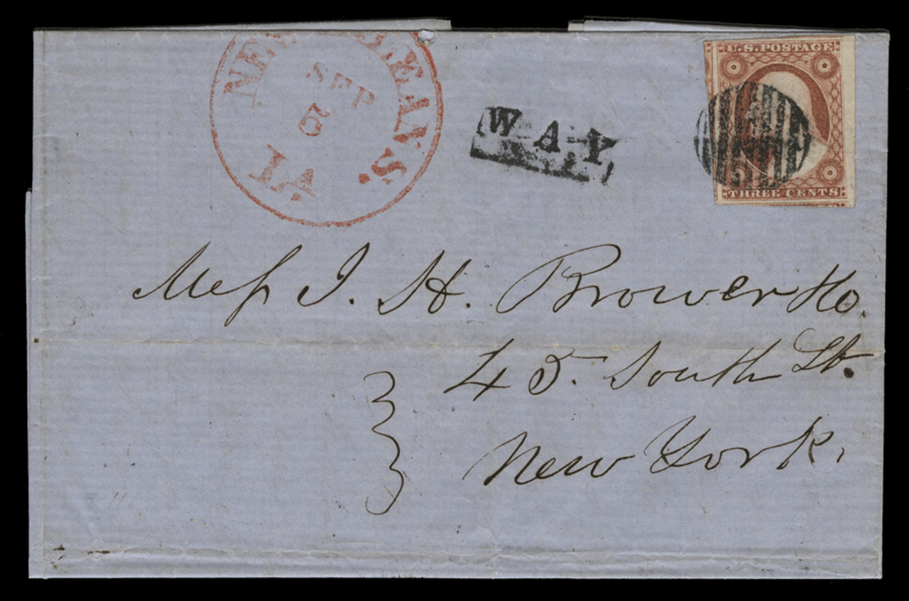 1851 3¢ dull red four-margin single tied by black grid cancel on 1854 folded letter from New Orleans to New York City.  Black "WAY" handstamp at left of stamp.  Cover datelined "At Mr. Mills Residence, Out of Town" and docketed "Galveston."  An extremely fine 3¢ 1851-57 Issue way usage from New Orleans.