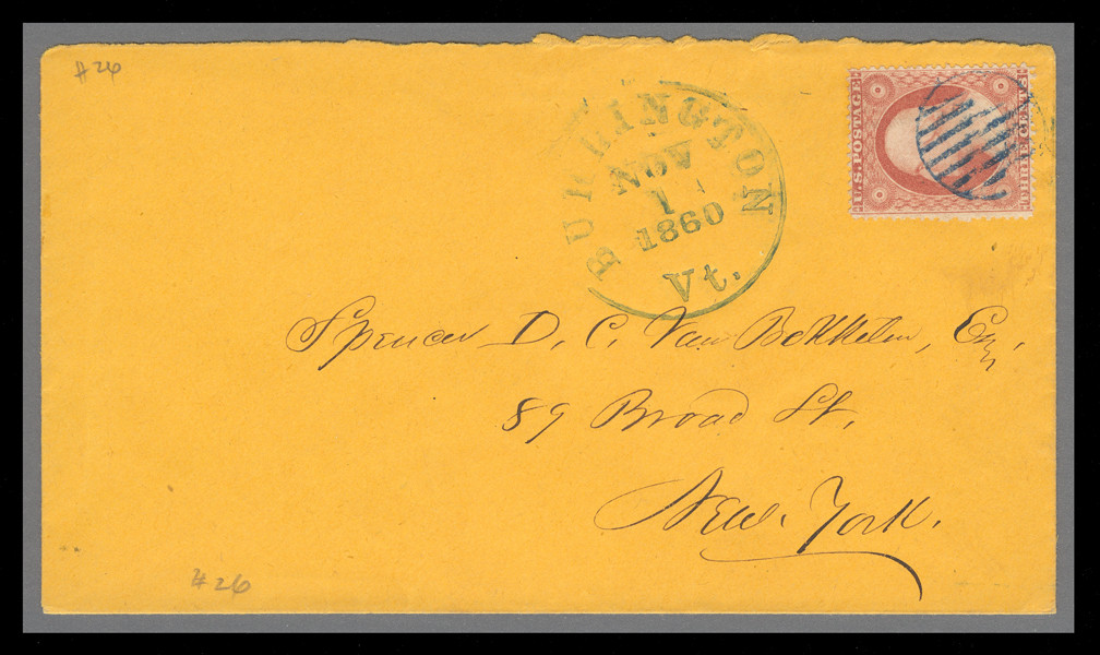 1857 3¢ dull red Washington single tied by blue grid cancel with accompanying November 1, 1860, Burlington, Vermont, circular date stamp cancel on cover to New York City.