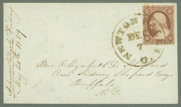 1857-61 Issue 3¢ Washington Type III single tied by olive green December 7, Newton Falls, Ohio, circular date stamp cancel. On a very fine, small format cover to Buffalo, New York. Stamp scissor cut at left outside of frameline – still a very fine and rare example of a green circular date stamp cancel on a 3¢ 1857-61 Issue cover.