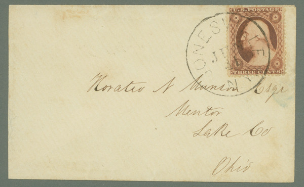 1857-61 3¢ Washington Type III single tied by black Jonesville, New York circular date stamp cancel on cover to Mentor, Lake County, Ohio.  The stamp exhibits very fine-extremely fine centering with the cover in beautiful overall condition.  A beautiful 3¢ 1857-61 cover from this small New York town.