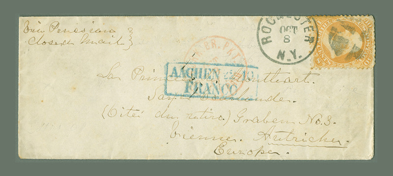 1861 30c Franklin on Ladies Cover from Rochester, New York, to Vienna, Austria. Stamp is struck with two cancels, including a partial “ROCHESTER N.Y. OCT 8″ circular datestamp. Other neat markings include ‘NEW YORK BR. PKT.” paid and blue “AACHEN FRANCO.” Nice usage and markings on ladies cover.