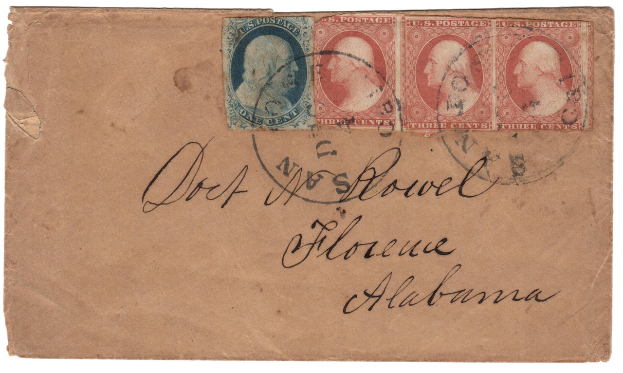 MRS1835 – 1851 3c Orange Brown Washington (#10A) on Cover to Florence, AL