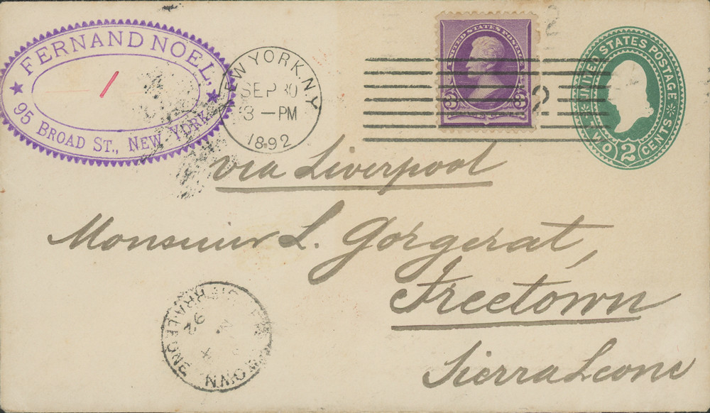 Also on the front of this cover is a purple handstamp that reads "Fernand Noel, 95 Broad St., New York." The fine, artistic handwriten adress on the front adds to the nostalgia of this cover and reads "via Liverpool Monsieur L. Gorgerat, Freetown, Sierra Leone."