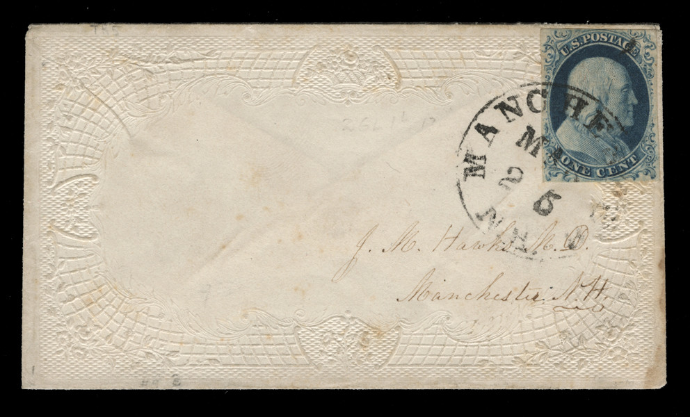 1852 1c blue Franklin Type IV recut once at bottom & twice recut at bottom single used on embossed ladies’ drop cover in Manchester, New Hampshire. A very fine 1c Type IV stamp in a sharp blue color tied by Manchester, New Hampshire, circular date stamp cancel.