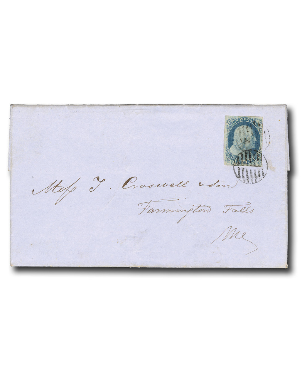 1852 1c blue Franklin Type IV single on 1853 dated printed circular from Portland, Maine, to Farmington Falls, Maine. A very fine stamp tied by two black 7-grid cancels.