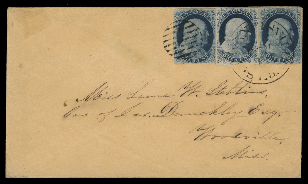 1851-57 Issue 1¢ blue Franklin singles. Tied by black grid cancel and black November 13, St. Francisville, Louisiana circular date stamp cancel on cover to Woodville, Mississippi.