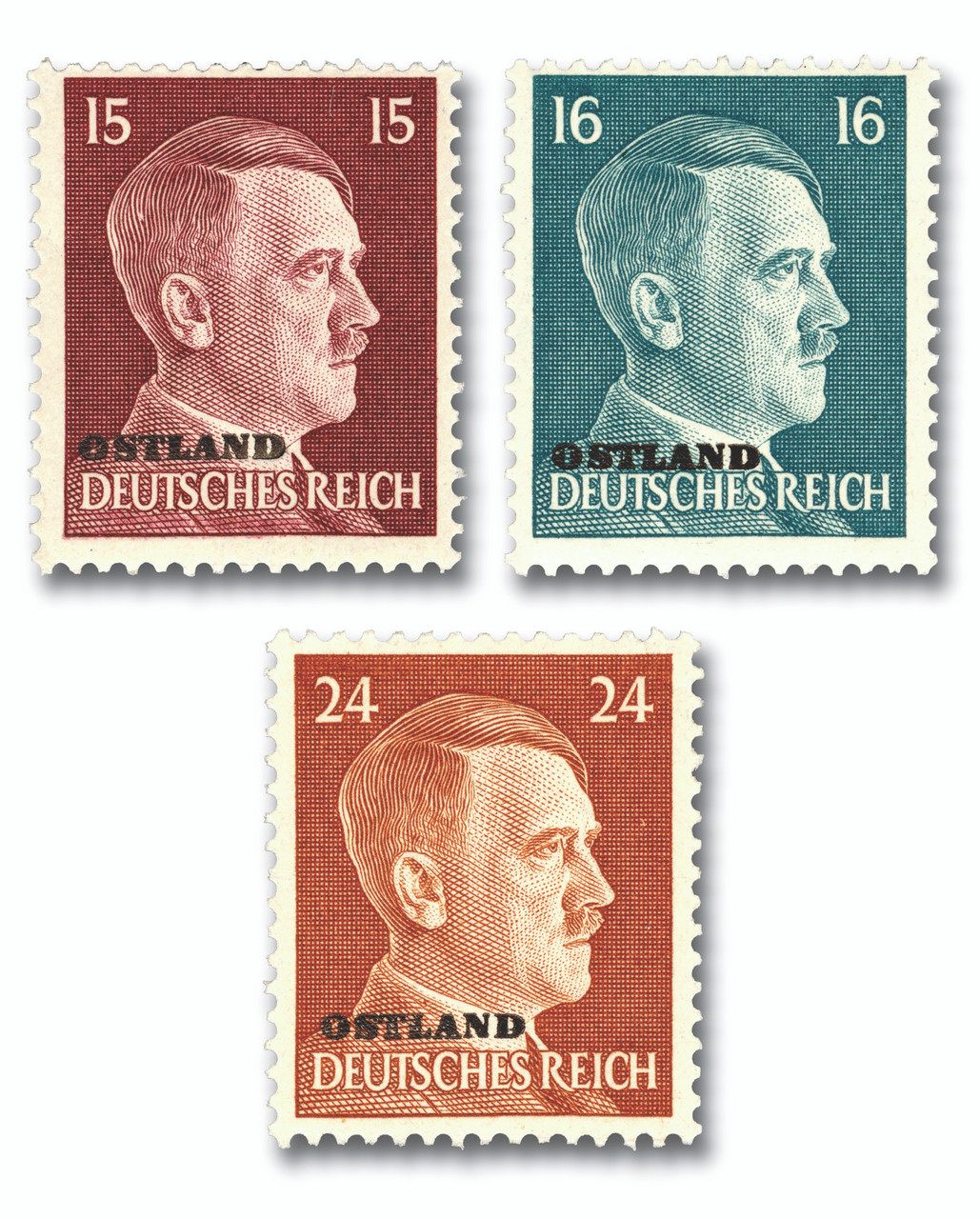 These World War II–era stamps were issued by Nazi Germany for use in Ostland, the occupied Baltic territories (present-day Latvia, Lithuania, Estonia, and parts of Belarus). The stamps began as standard issues of the Deutsches Reich, featuring the profile of Adolf Hitler, and were later overprinted “OSTLAND” to designate their use in the occupied region.