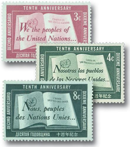 The 10th anniversary of the United Nations, October 24, 1955, was celebrated with this issue.