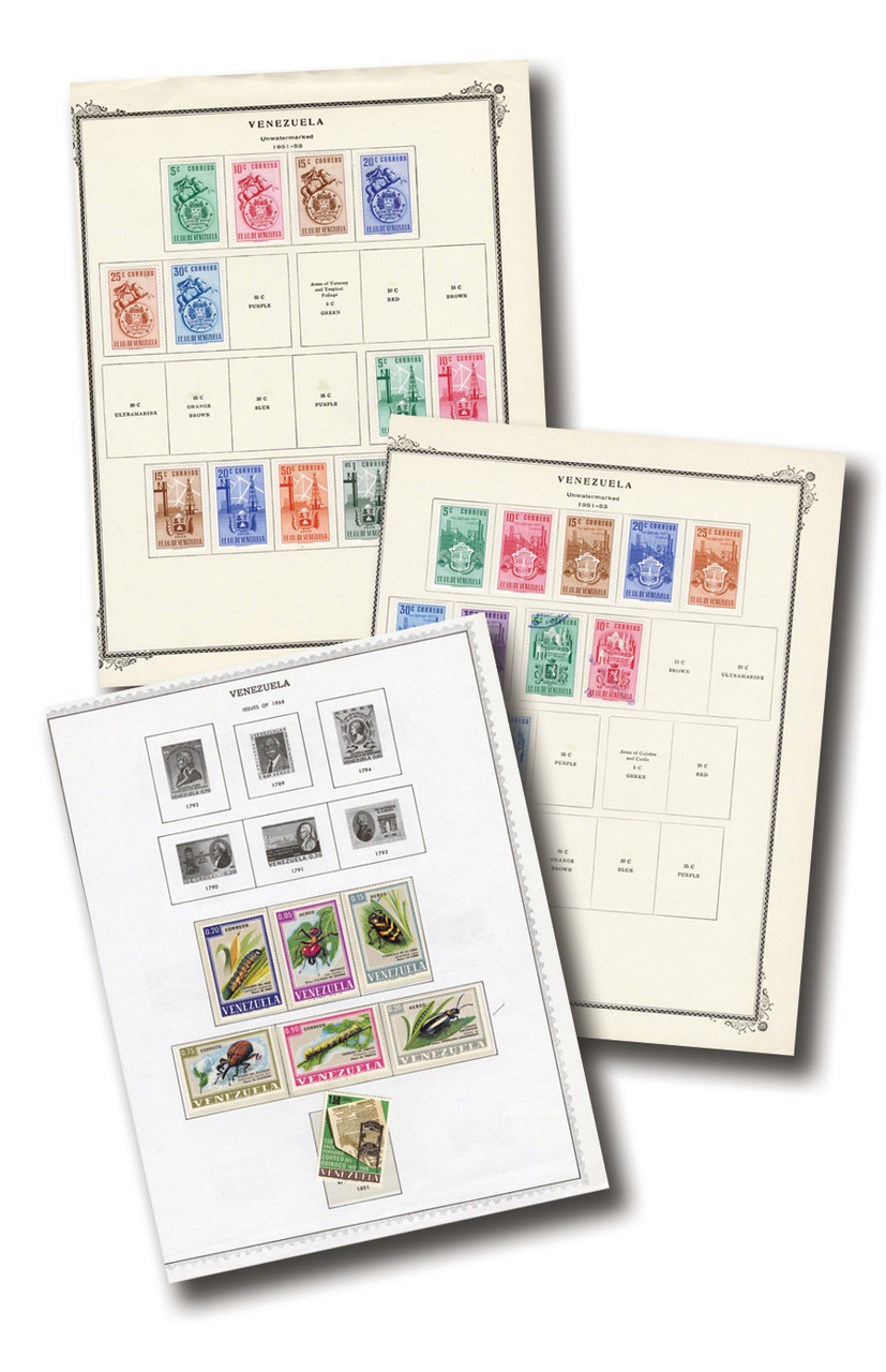 100+ mint and used Venezuela stamps, 1950-95. Singles and sets. Includes some Airmail stamps and souvenir sheets. On 20-30 album pages. Scott Catalogue value $889.