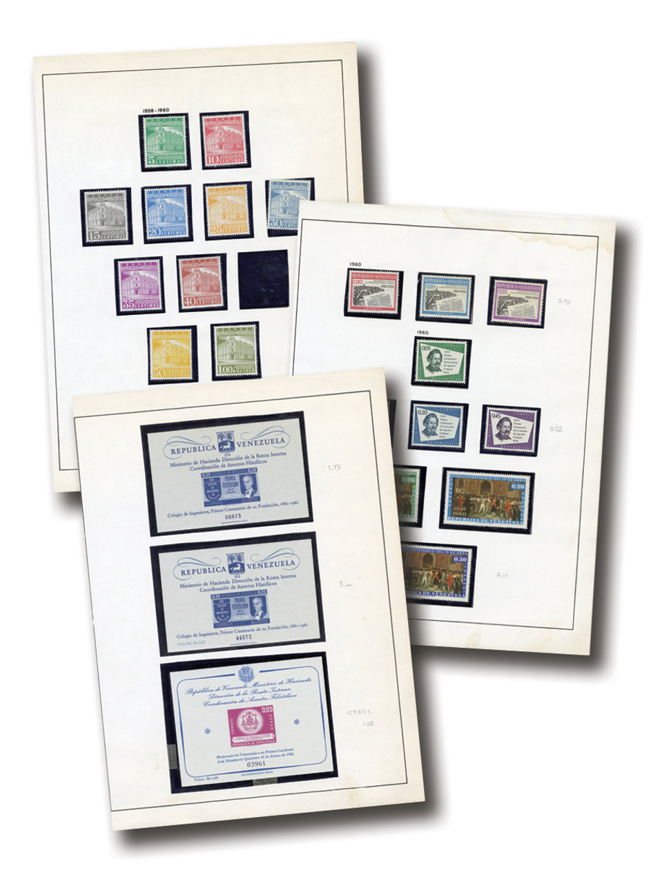 300+ mint and used Venezuela stamps, 1952-69. Singles and sets. Includes three sheets of 50 plus some Cinderella stamps. On 40-50 album pages. Scott Catalogue value $535.