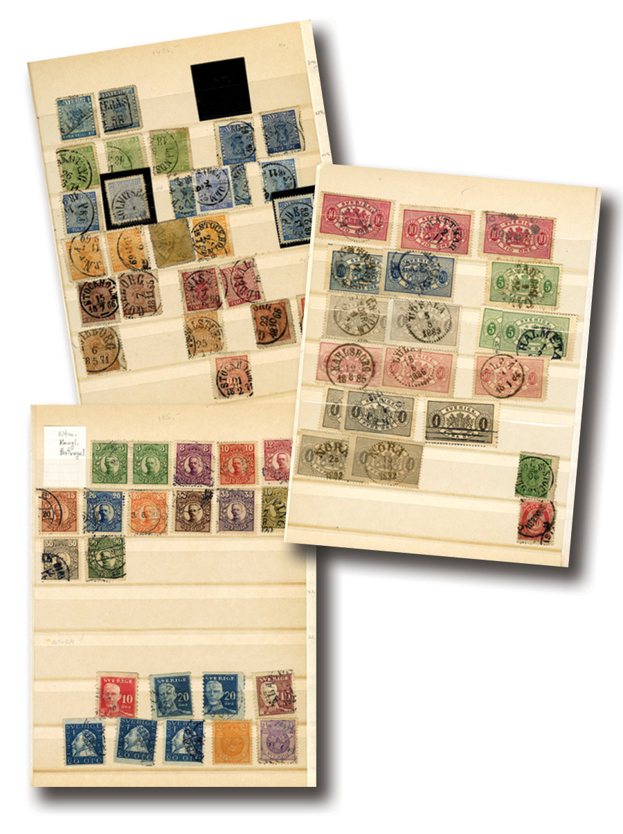 220+ Sweden stamps, 1855-1918. In stock book. Scott Catalogue value $3,116.