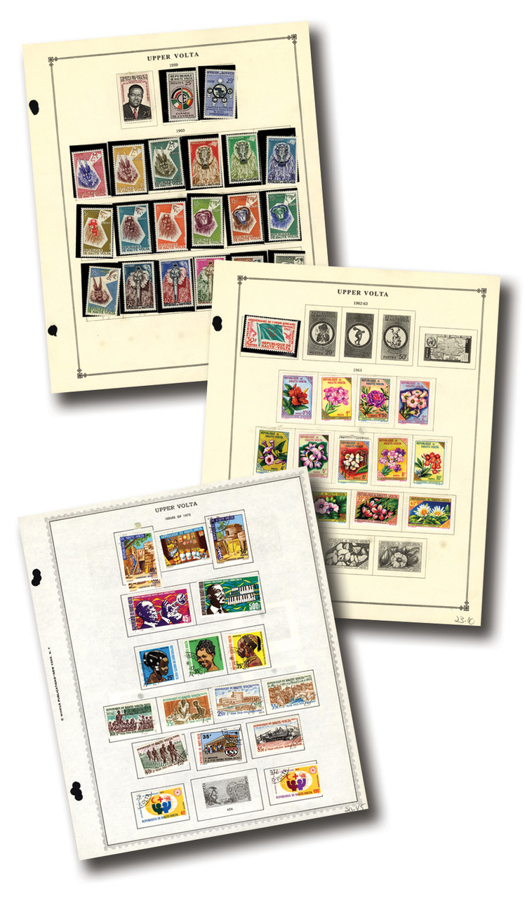 130+ Upper Volta stamps, 1920-1980. On Minkus album pages. Scott catalog value $282.