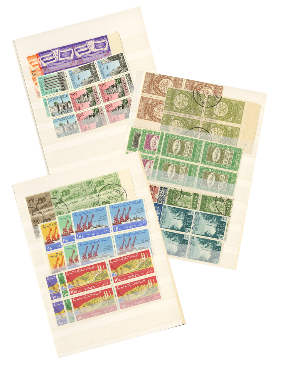 Over 70 Yemen stamps, issued between 1930 to 1949. In a amall stock book.