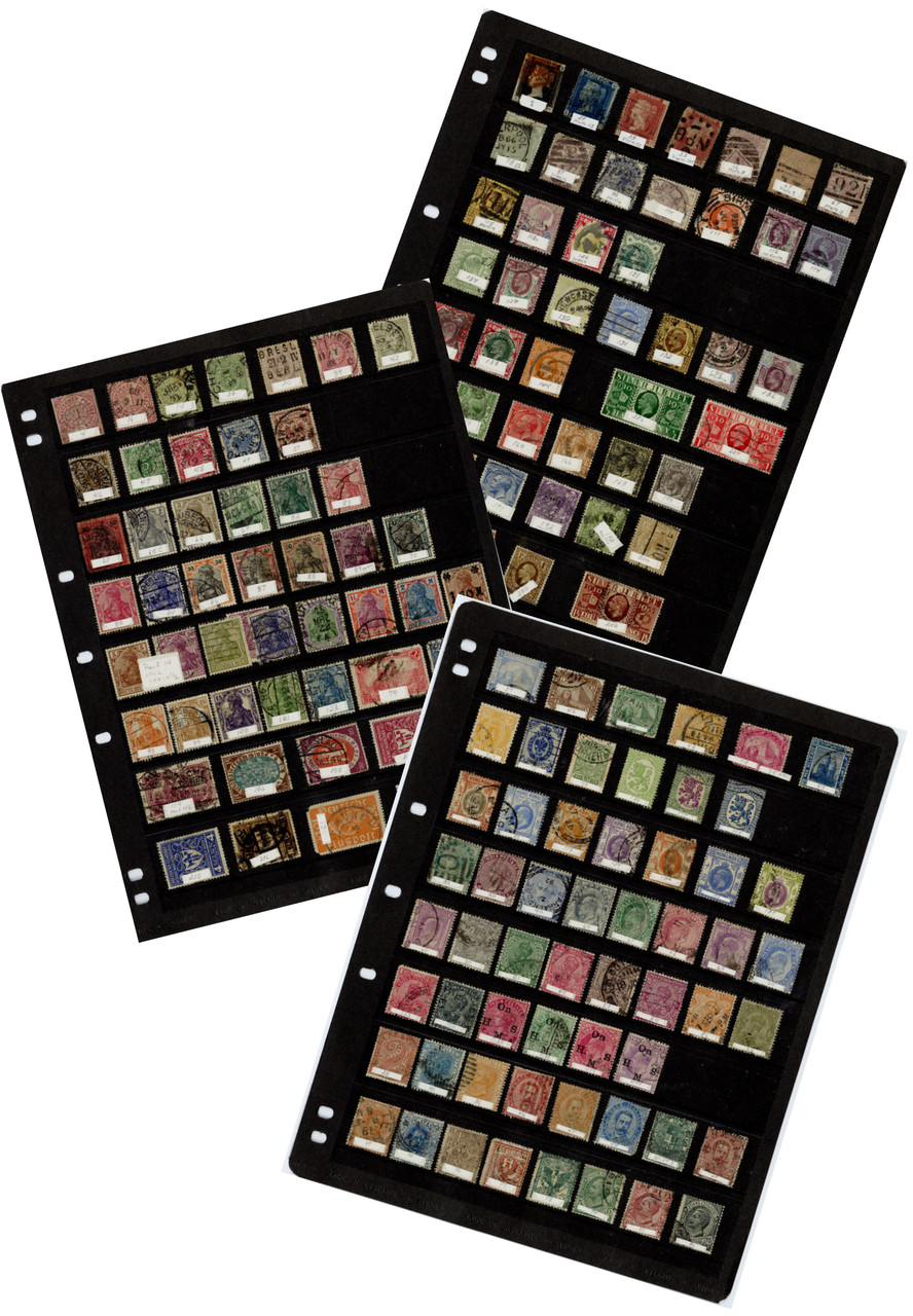 Over 200 postally used stamps from countries around the world. Issued in the 1800s and 1900s. In black stock pages. Countries include: Great Britain, France, and more.