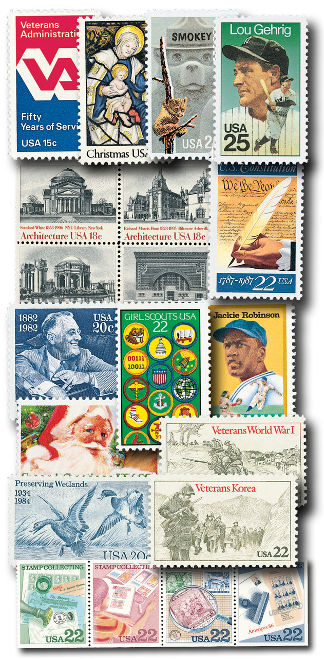 The commemoratives of the 1980s featured lots of neat topics. There were stamps honoring Indian masks, Helen Keller and Anne Sullivan, the American Red Cross, Frederic Remington, the battle of Yorktown, Jackie Robinson, FDR, the Medal of Honor, the Treaty of Paris, Korean War veterans, Lou Gehrig and so many more. And you’ll get stamps from popular ongoing series, including Love, Black Heritage, Christmas, and more!