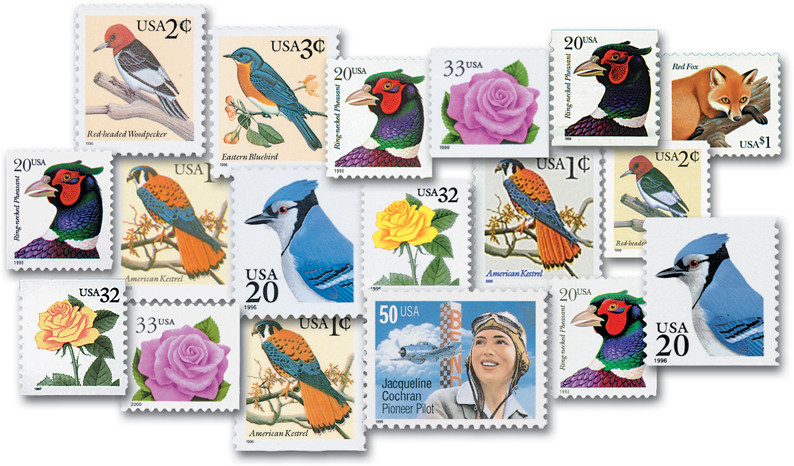 • The six 1996 Flora and Fauna stamps – 2¢ red-headed woodpecker, 3¢ eastern bluebird, 1¢ American kestrel, 20¢ blue jay (booklet single and coil single), and 32¢ yellow rose