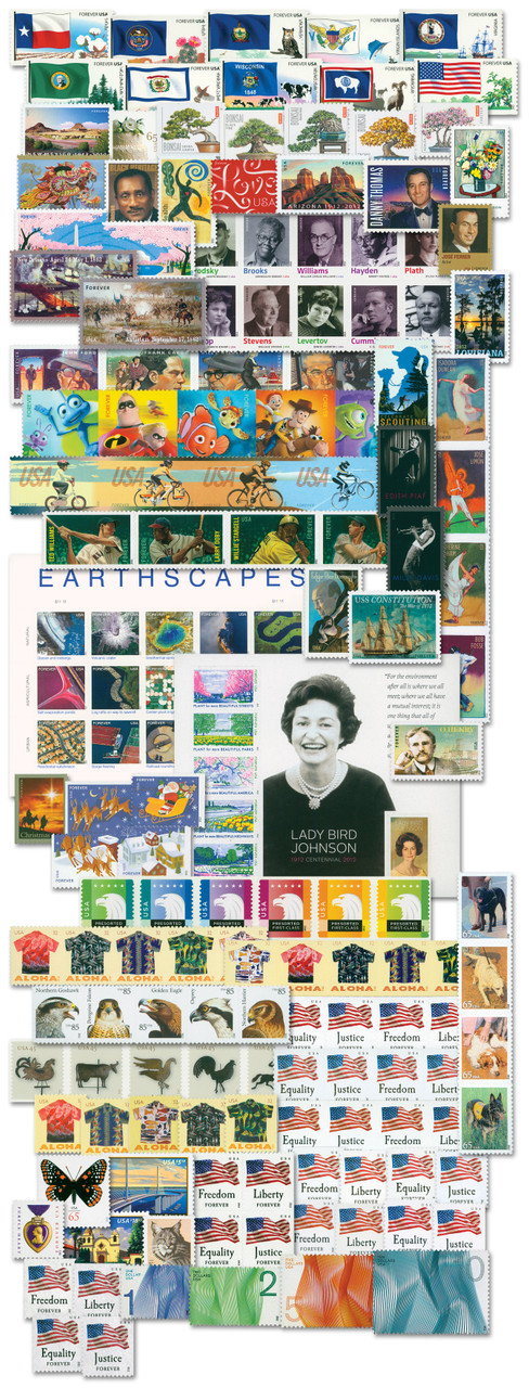 Save time and money with this year-set. You’ll receive every major Scott number issued in 2012 – plus the Priority and Express Mail stamps – in one order. The easy way to fill gaps in your collection. 165 stamps total. (2012 small panes and Duck Stamps are not included – they are illustrated in the American Heirloom album, volume III.)